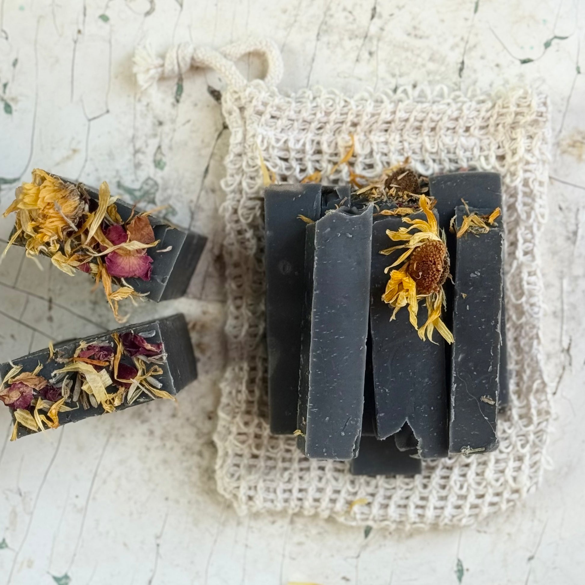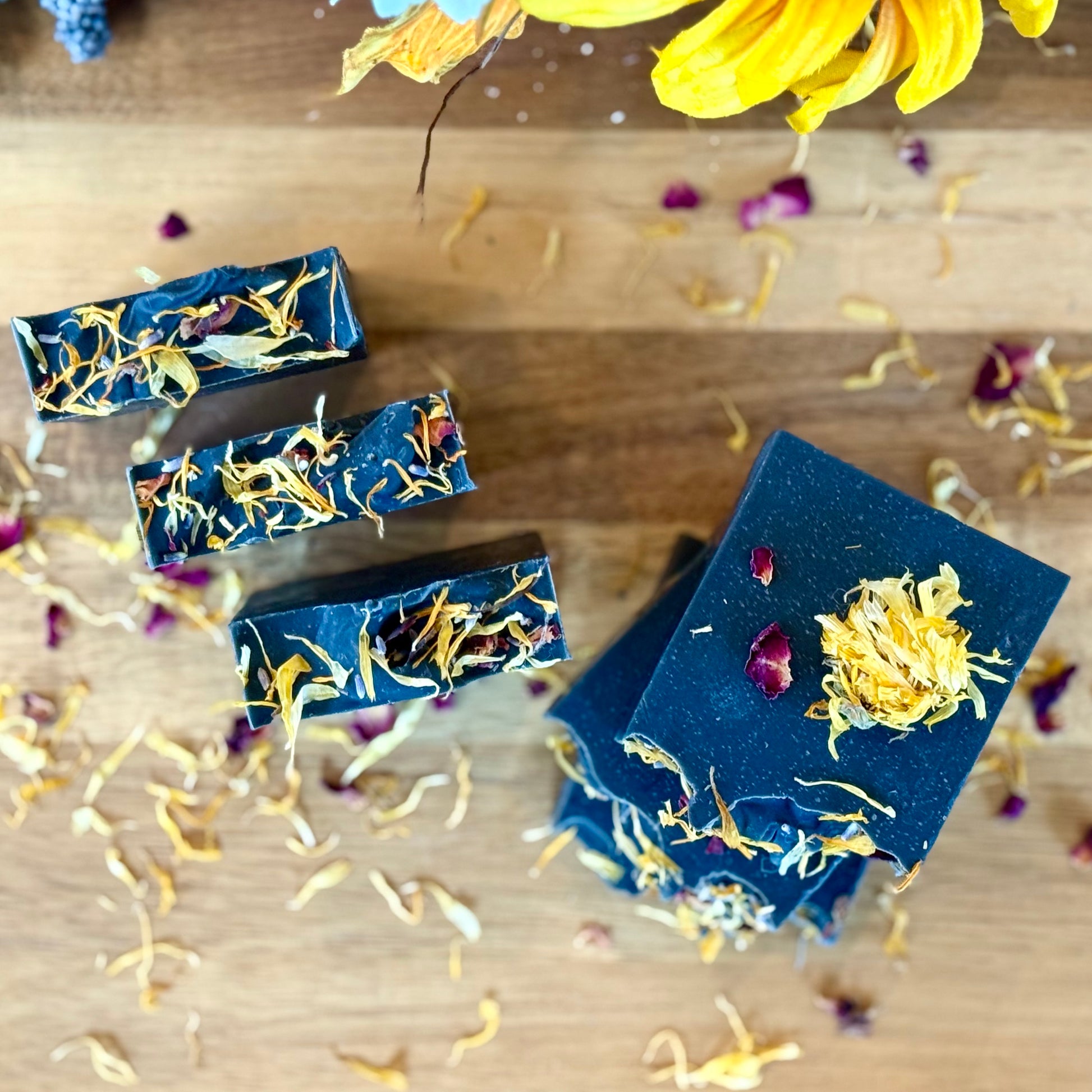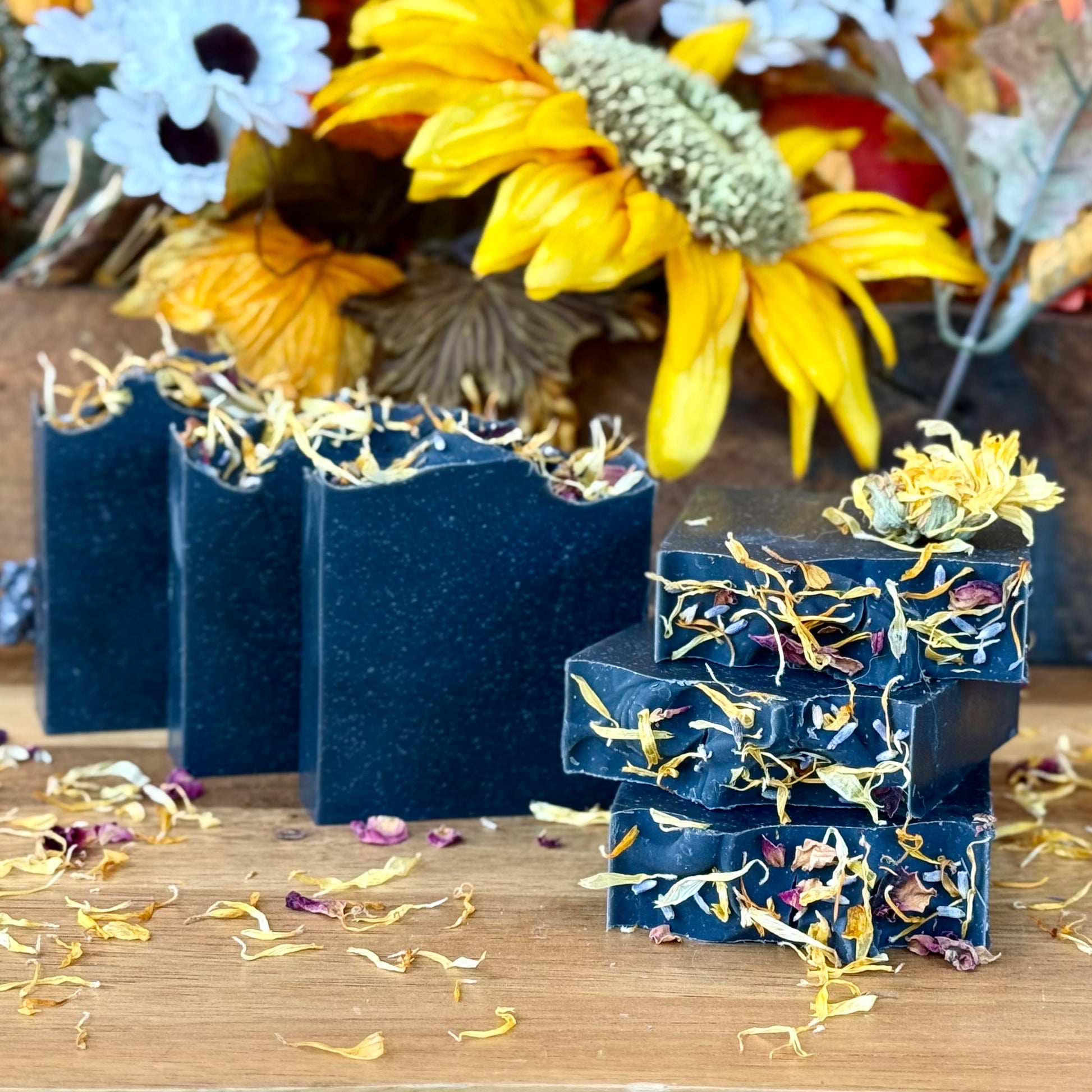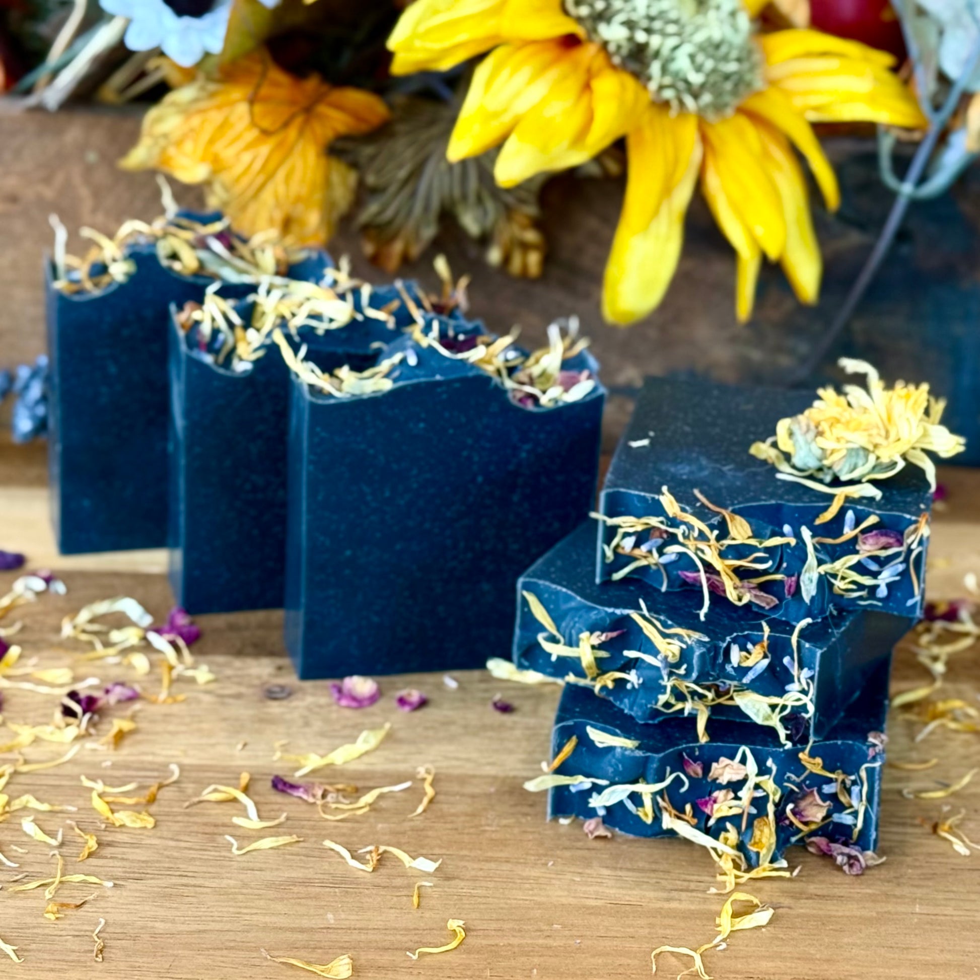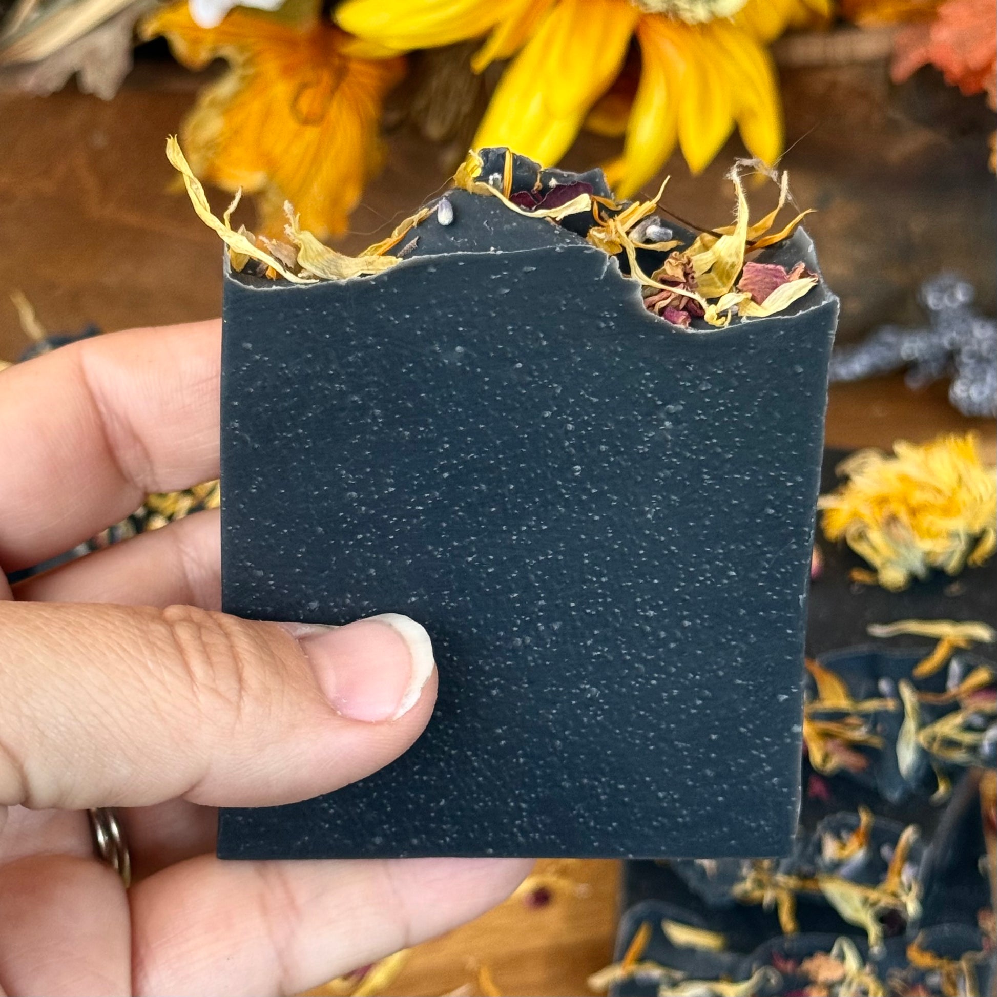 Ingredients: beef tallow, calendula-infused olive oil, black coffee, shea butter, coconut oil, castor oil, activated charcoal, lye, essential oils.