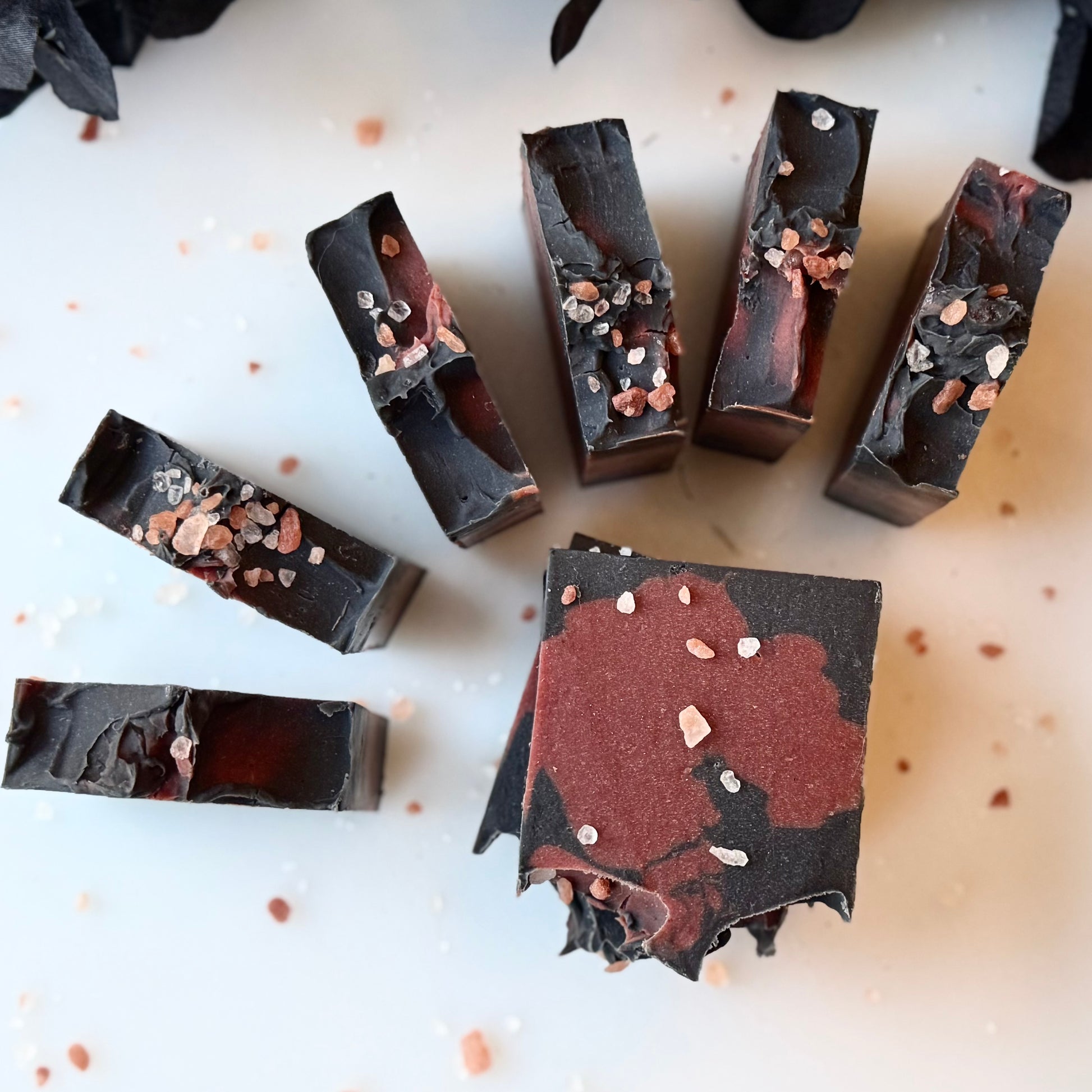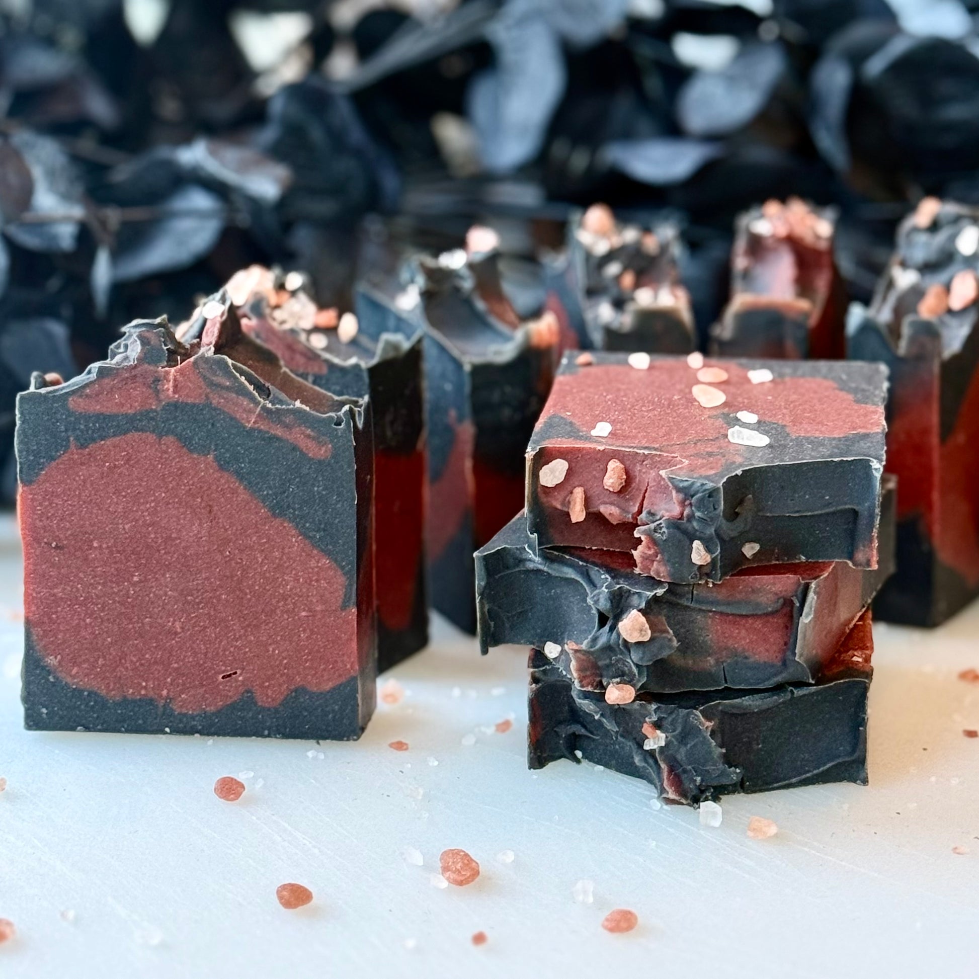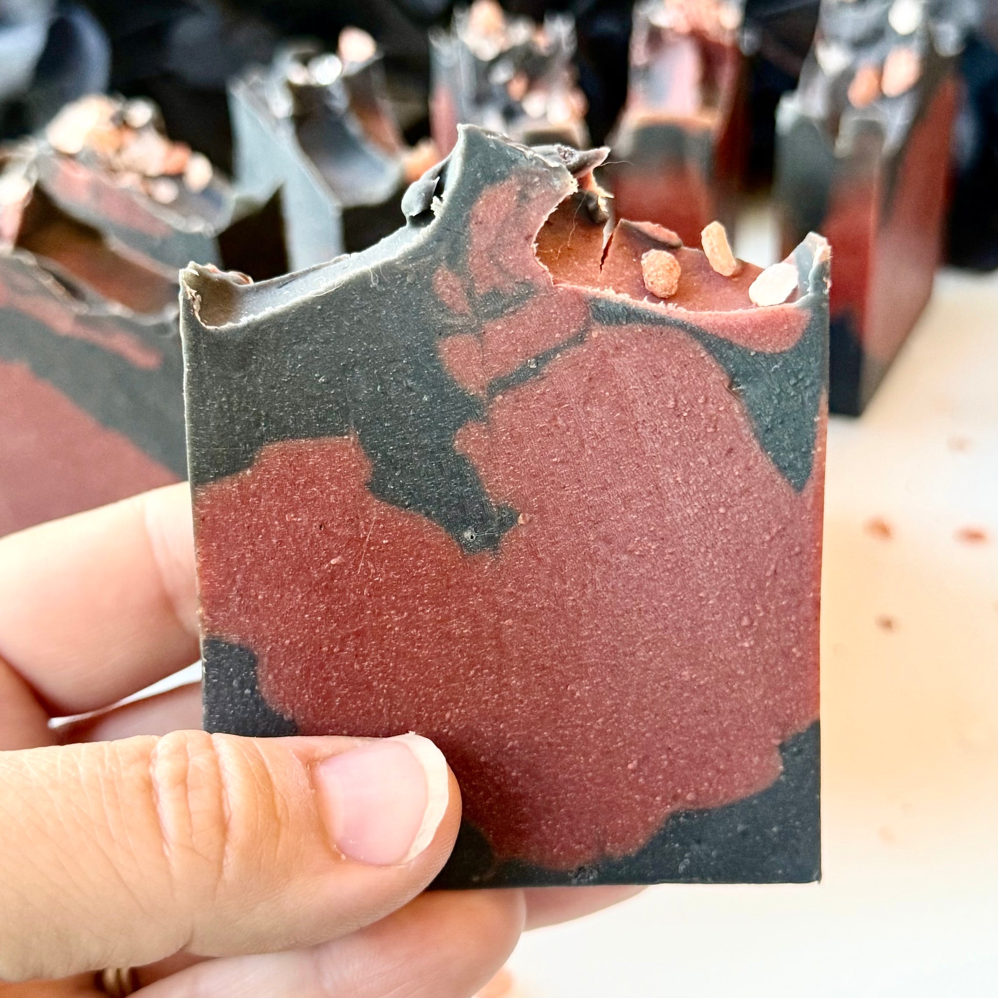 Ingredients: Himalayan Rhubarb infused olive oil, coconut oil, shea butter, sweet almond oil, castor oil, madder root powder, activated charcoal powder, water, lye, essential oils.