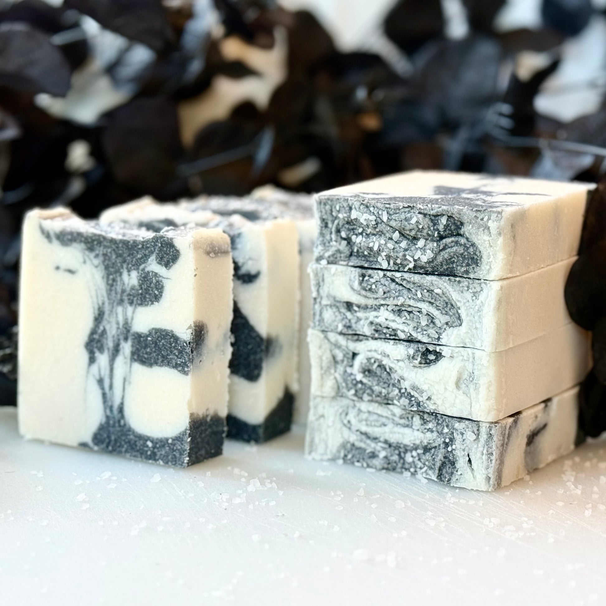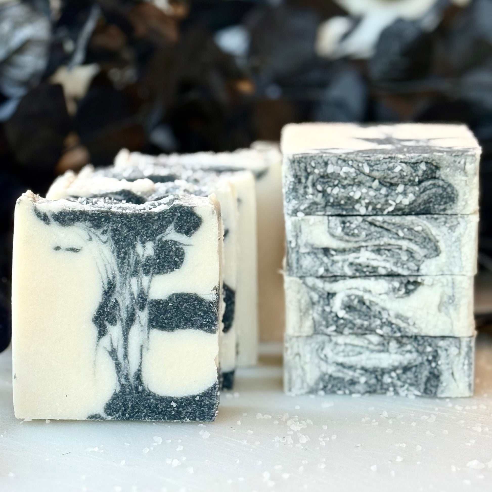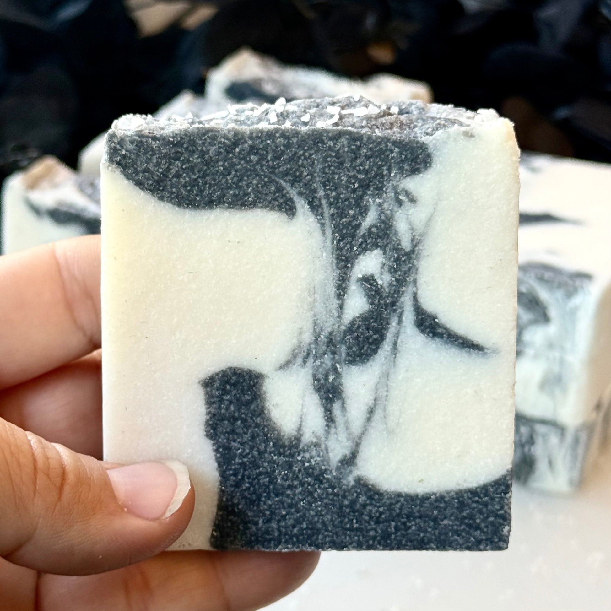 Ingredients: coconut oil, sea salt, olive oil, castor oil, water, lye, activated charcoal, essential oils.