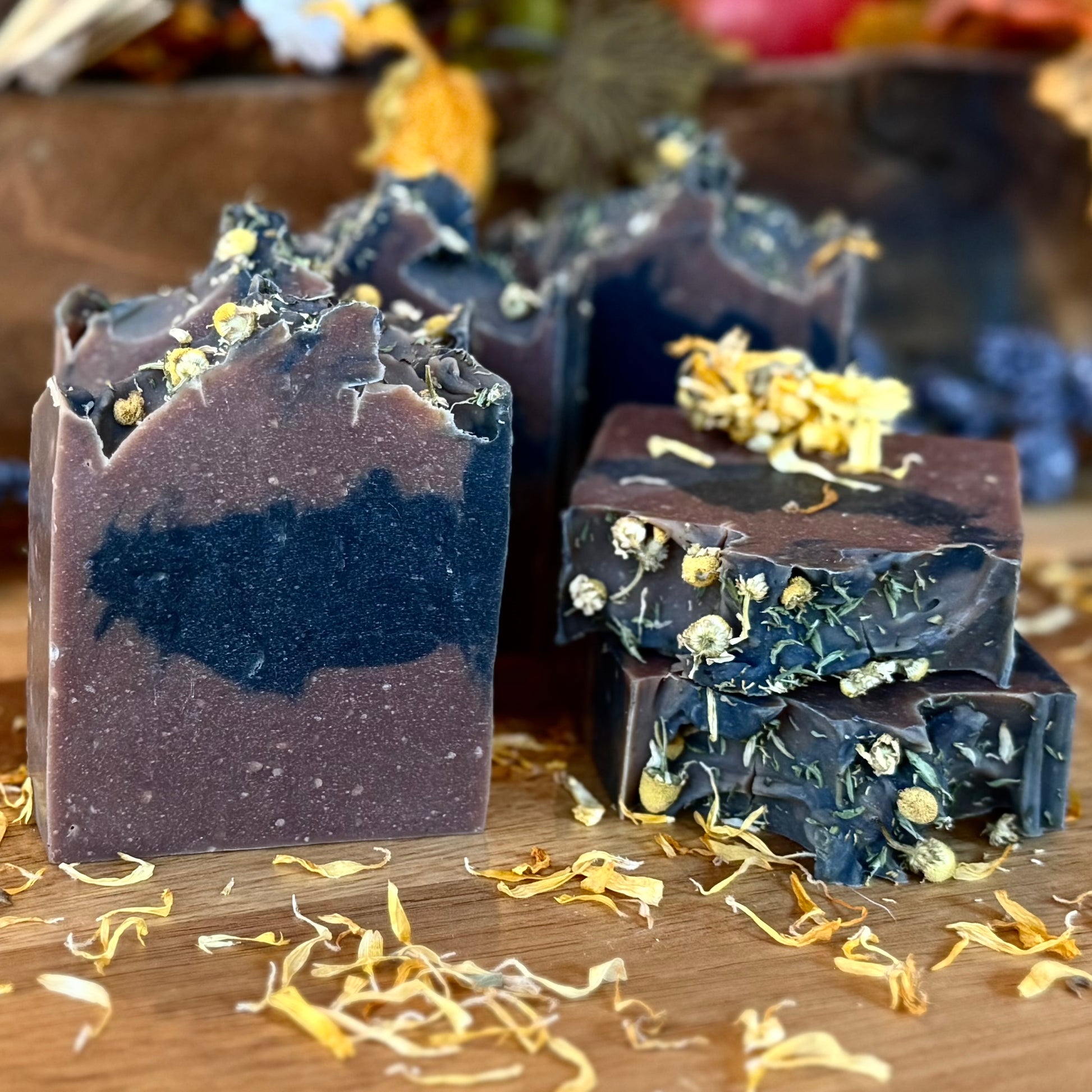 Ingredients: calendula-infused olive oil, coconut oil, shea butter, sweet almond oil, castor oil, black tea, coco powder, activated charcoal, lye, essential oils.