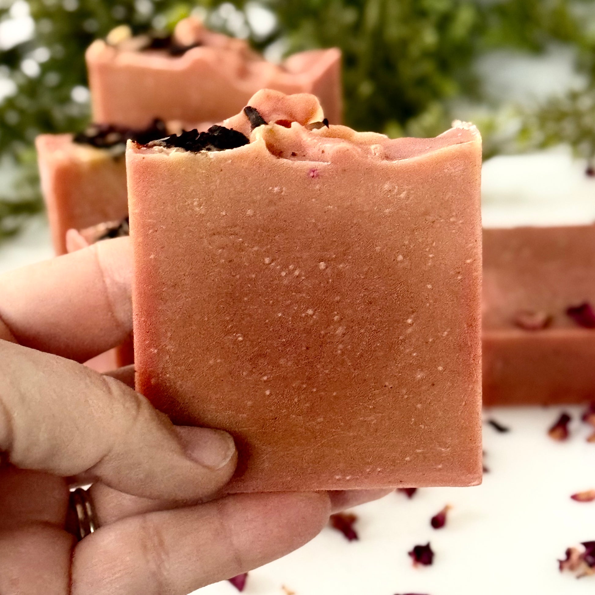 Ingredients: Himalayan rhubarb-infused olive oil, coconut oil, shea butter, castor oil, hibiscus tea, lye, essential oils.